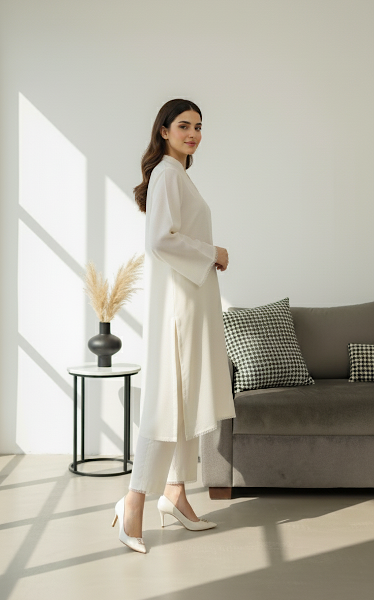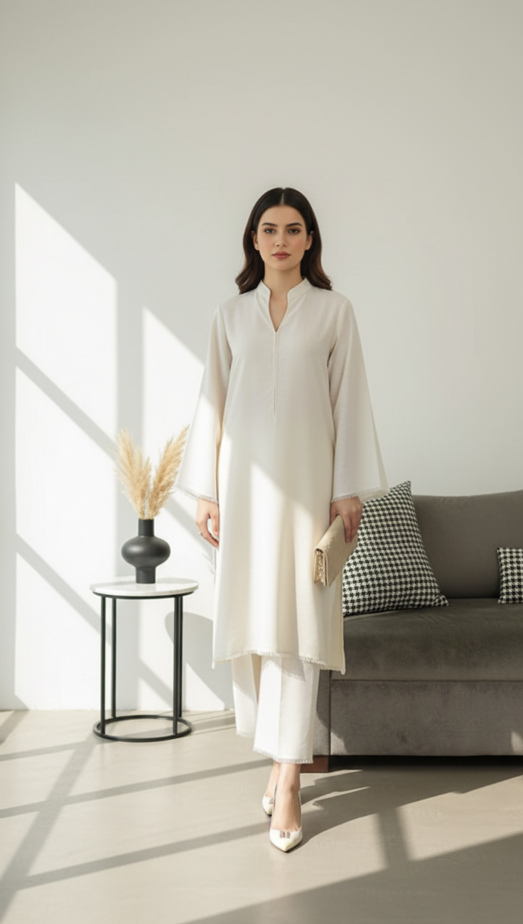 A serene off-white two-piece set featuring a modern V-split mandarin collar and delicate fringe detailing along the cuffs and hem. This ensemble is paired with matching straight-leg trousers, offering a clean and sophisticated minimalist aesthetic.