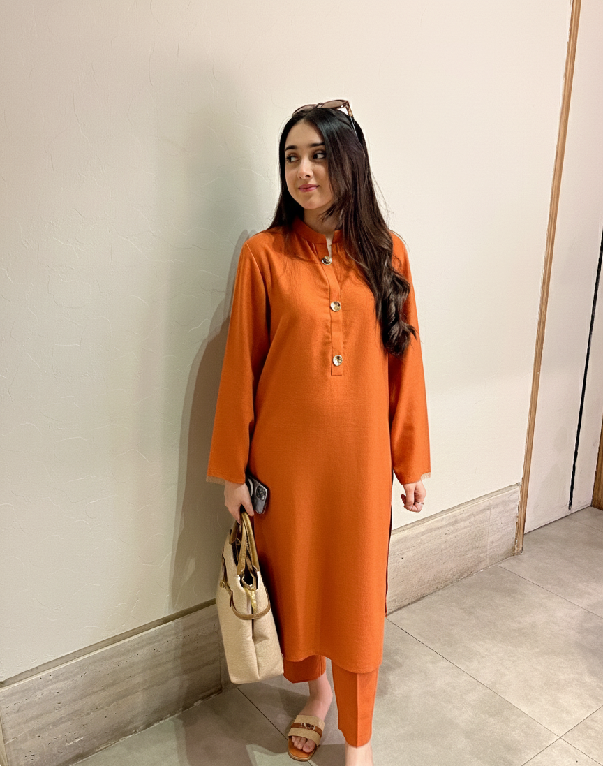 A vibrant burnt orange two-piece featuring a mandarin collar with metallic gold buttons and modern fringe detailing along the cuffs and hem. This ensemble is paired with matching straight-leg fringed trousers for a bold, contemporary look.