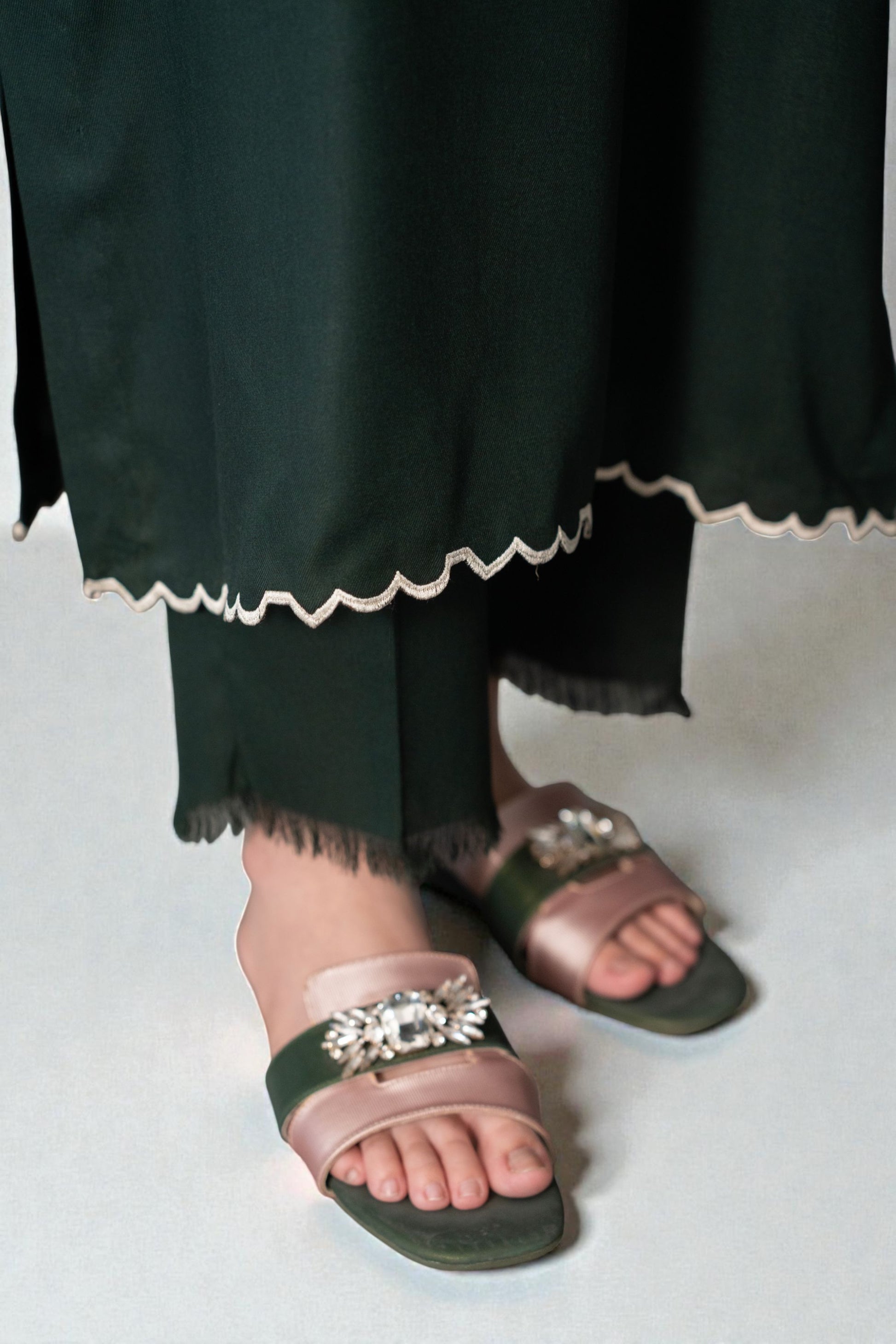 A sophisticated deep green two-piece set featuring a sleek banded collar and intricate cream lace bordering the cuffs and scalloped hem. Paired with matching straight trousers, this ensemble offers a refined, polished look for any occasion