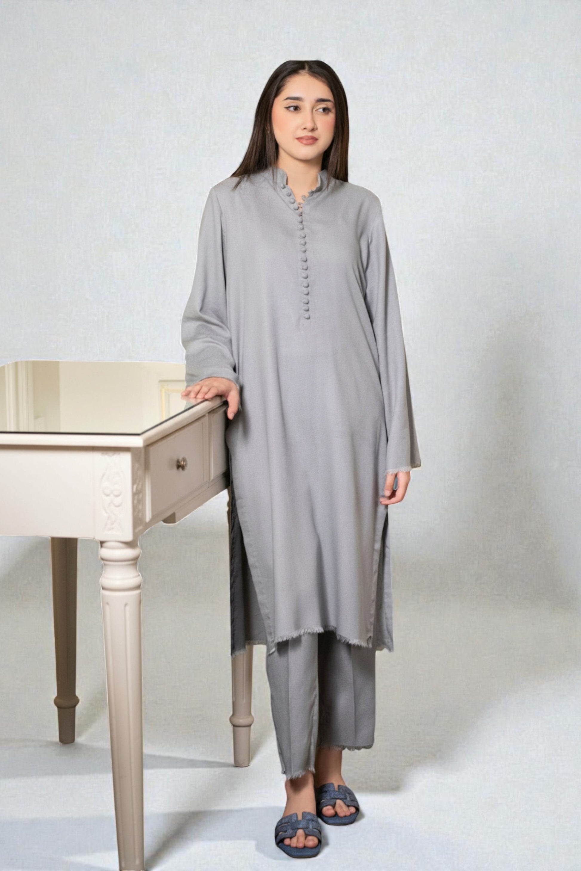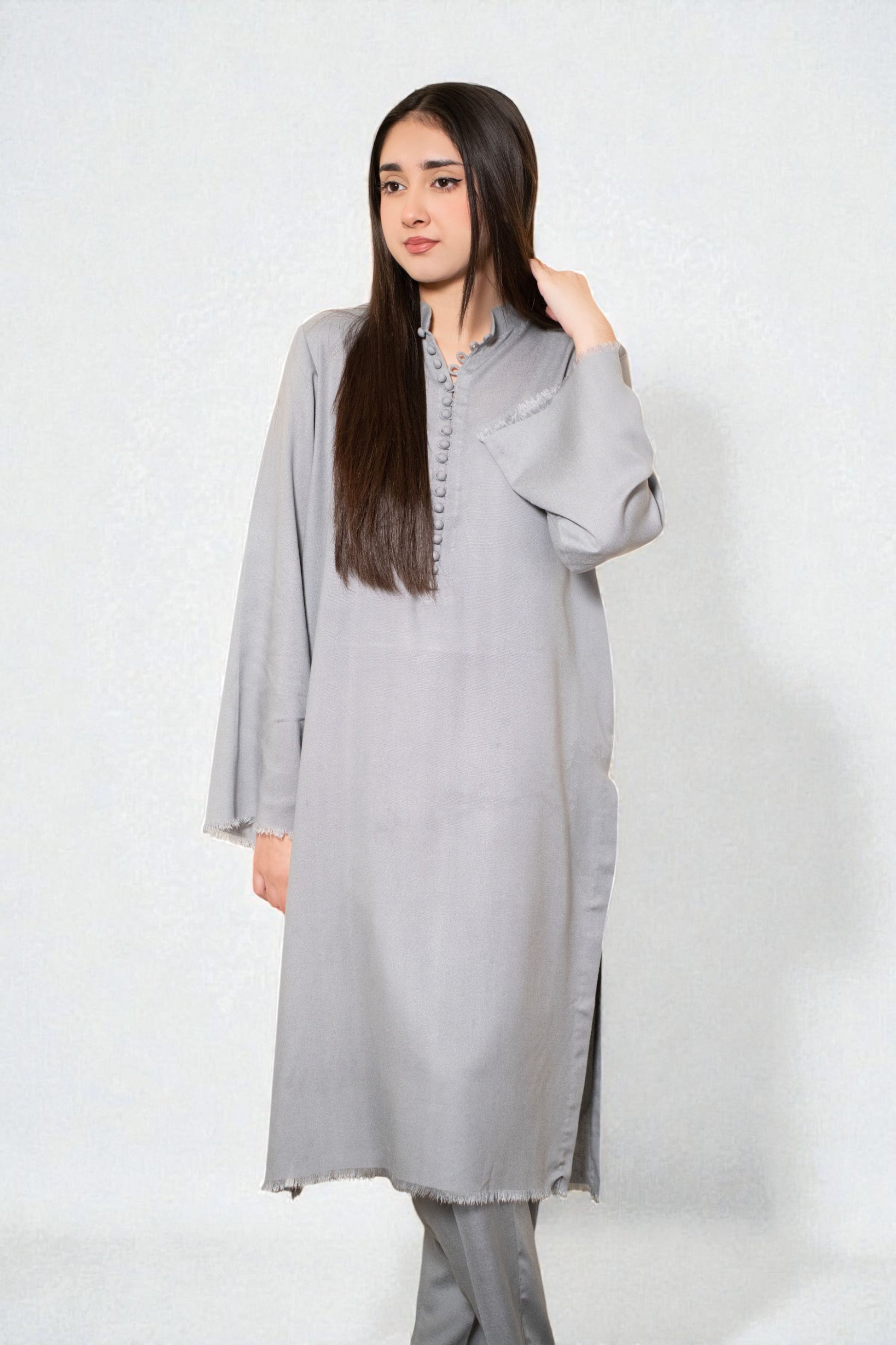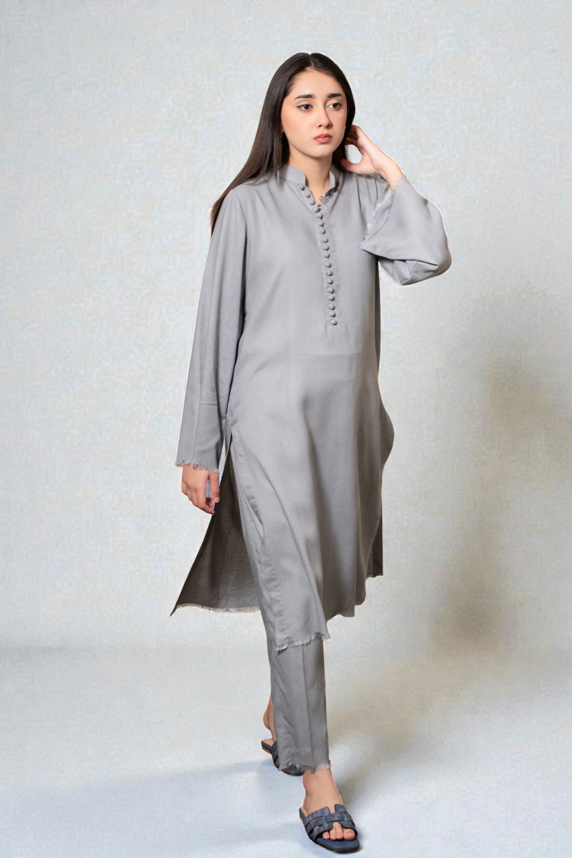 A versatile light grey Karandi two-piece featuring a banded collar with detailed potli button accents and fringes. This coordinated set includes both the tunic and matching slim-fit trousers for a complete, polished look.