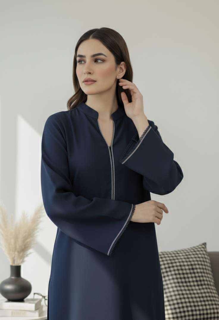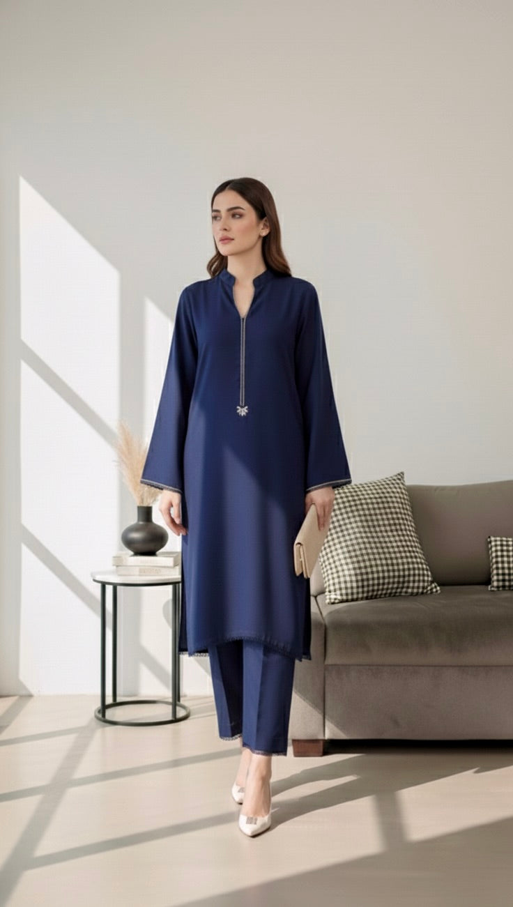 A sleek midnight navy two-piece featuring a sophisticated mandarin collar with delicate embroidery extending down the neckline and on the sleeves. This ensemble is finished with fringes on the hem and paired with matching straight-leg trousers for a contemporary, polished look.