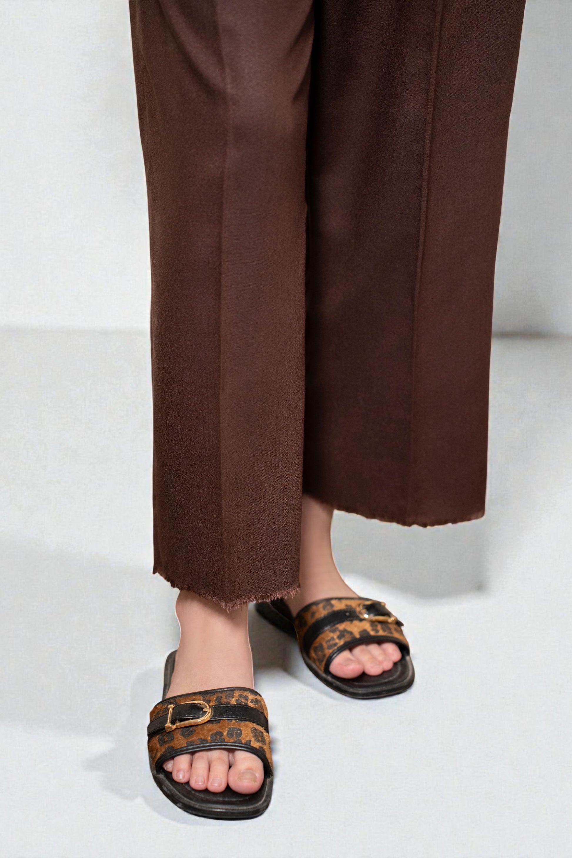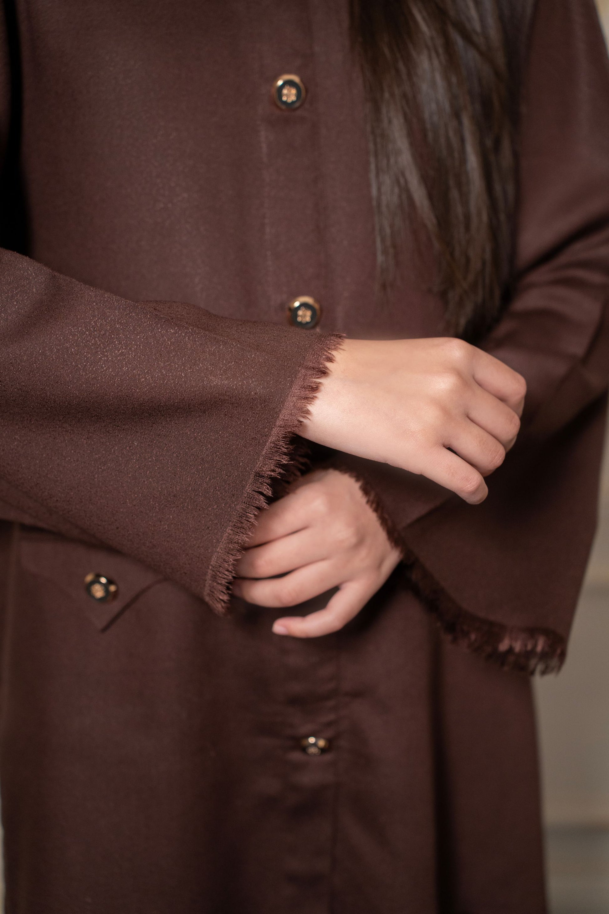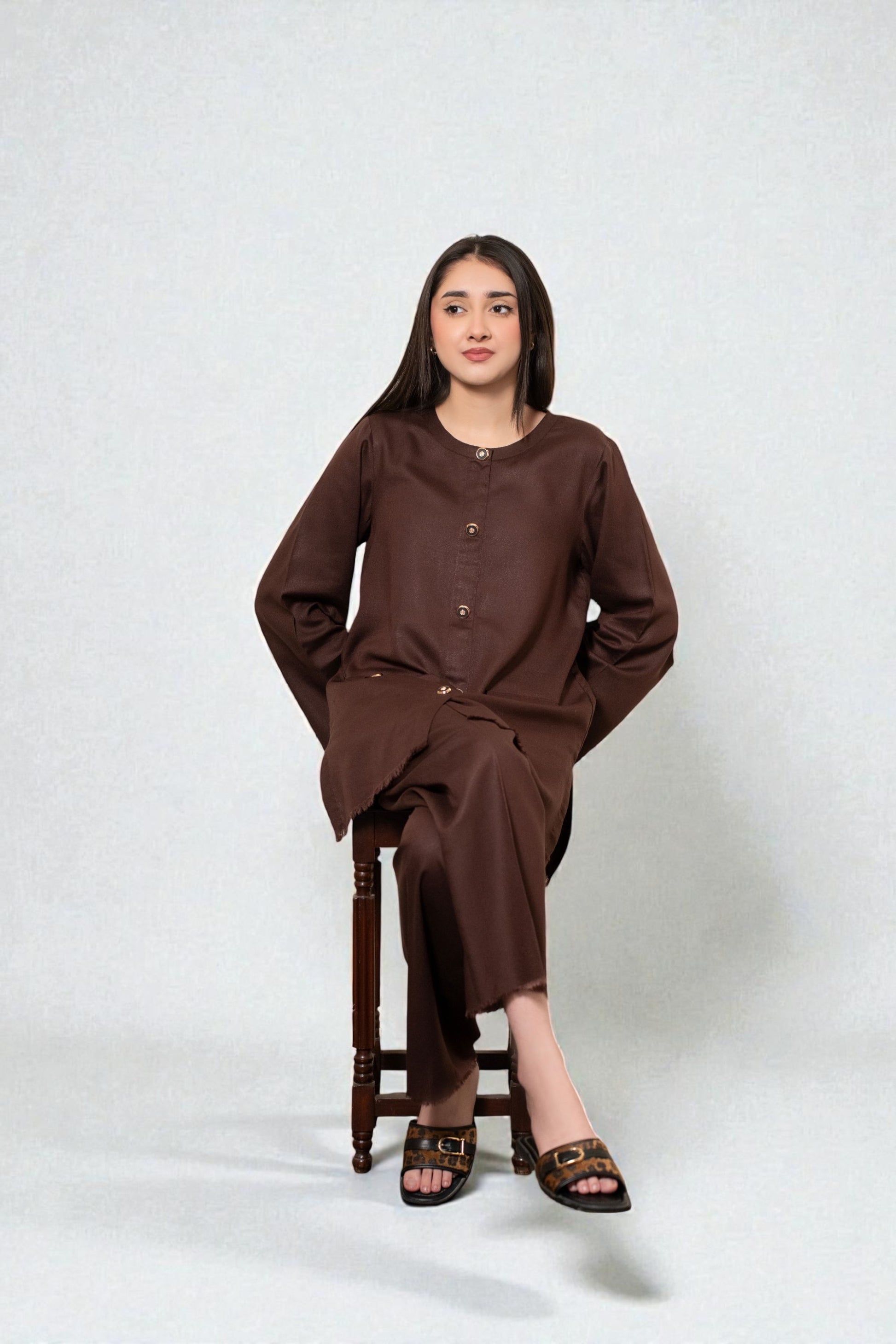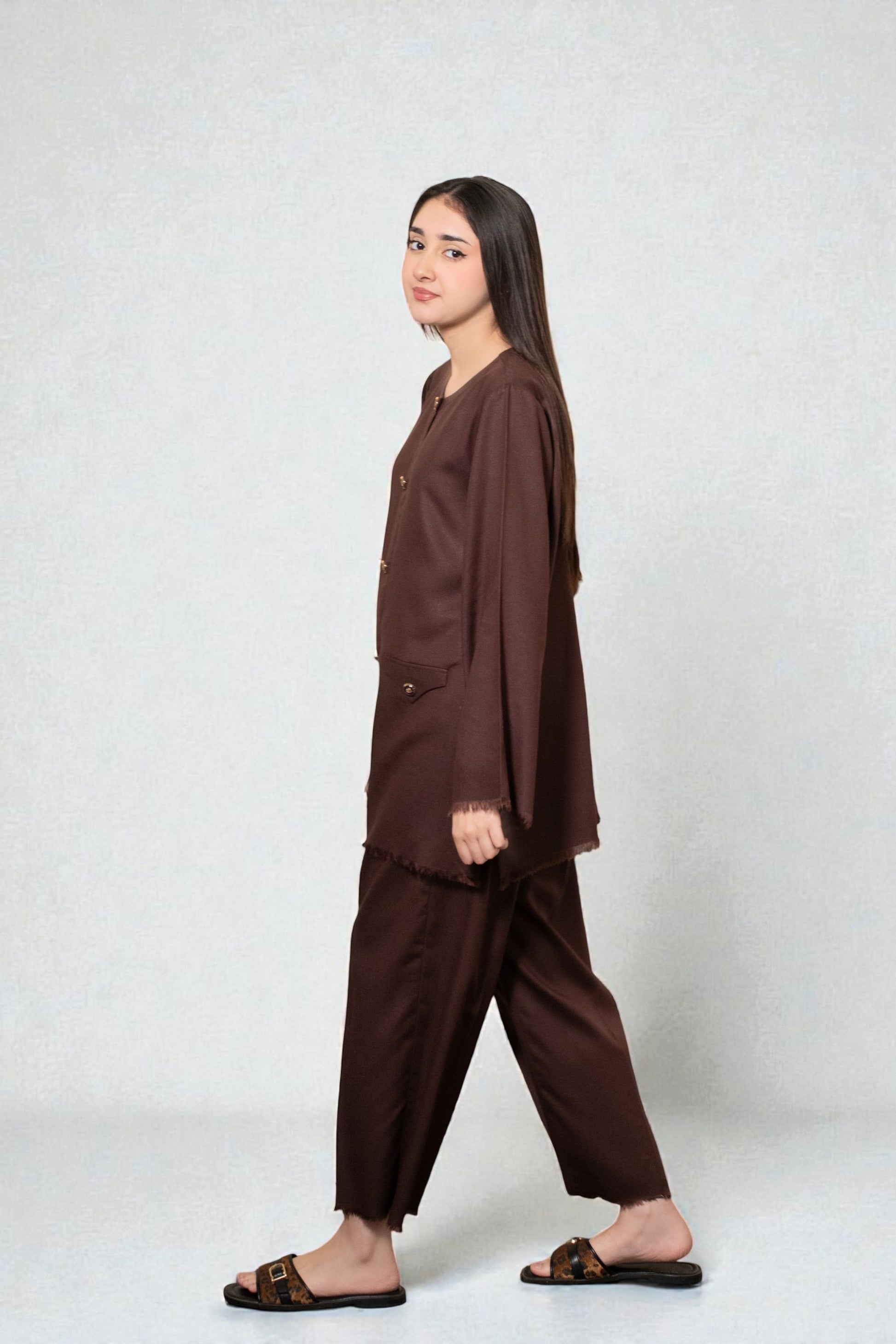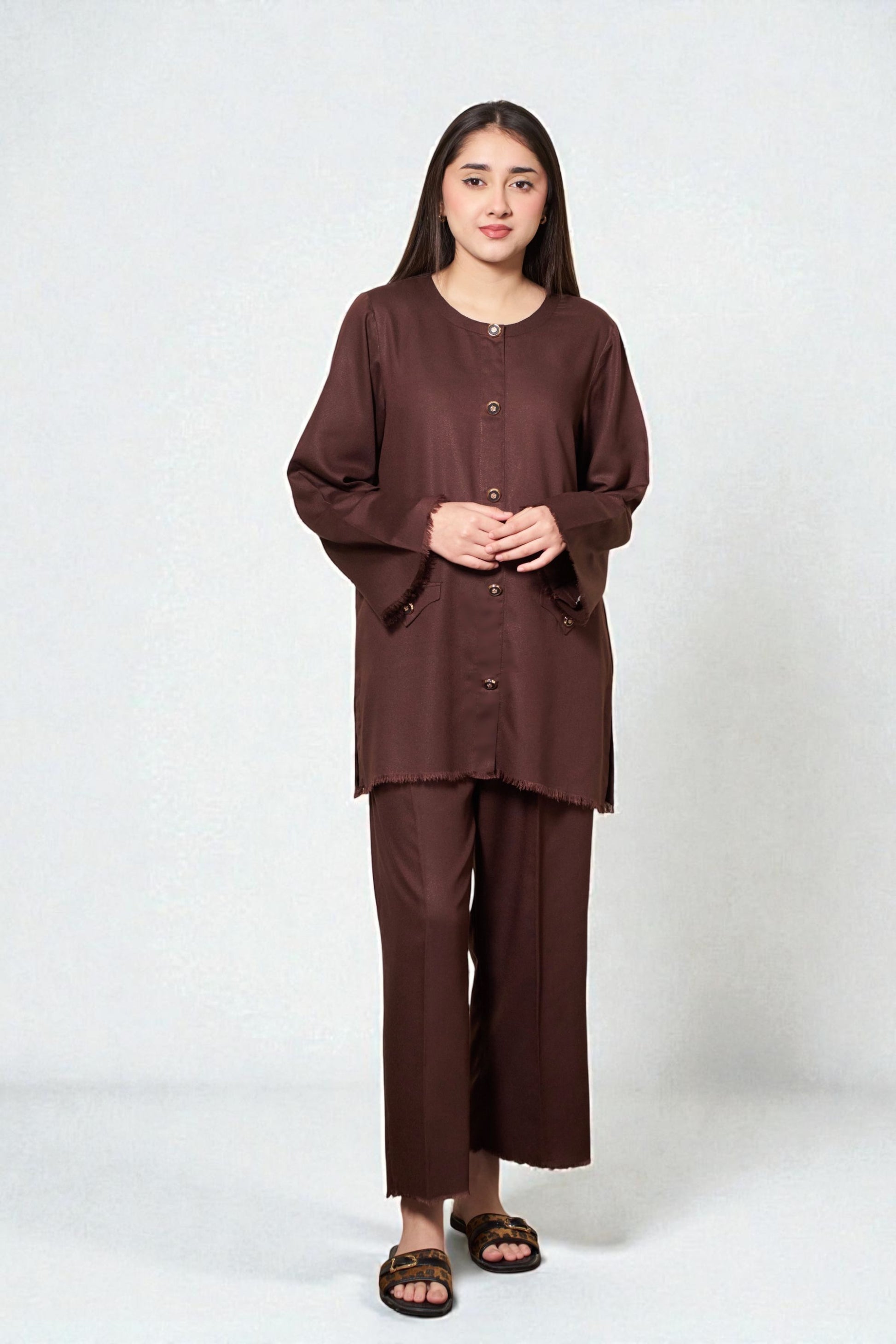 An elegant chocolate brown co-ord set featuring a tunic with a classic round neckline and decorative button-down detailing. Defined by modern fringes and wide-leg trousers, this set offers a relaxed yet polished aesthetic for everyday luxury.